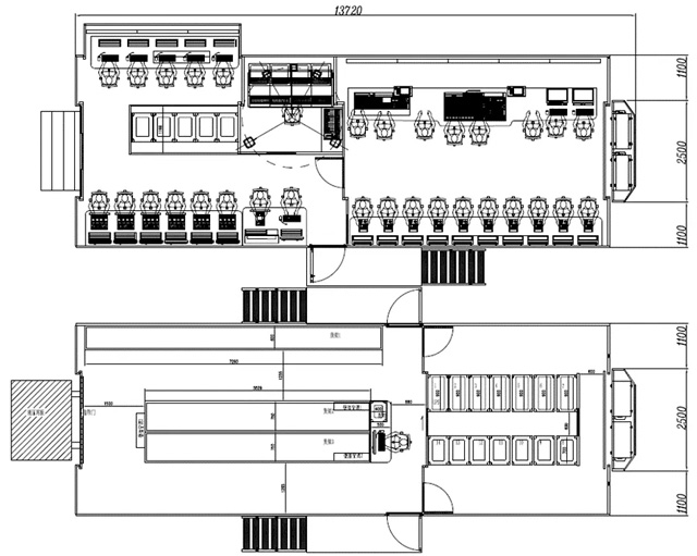 由于收車時內(nèi)套拉箱頂收回,強(qiáng)冷機(jī)柜若在拉箱區(qū),出回風(fēng)會很難設(shè)計,所以通常將強(qiáng)冷柜放在不帶拉箱的部位,加上兩側(cè)拉箱總寬度不得超2.5米,這導(dǎo)致整個廂體很難做大,以下是幾種最常見的布局,基本都是配備4組強(qiáng)冷機(jī)柜,如果想要增加強(qiáng)冷機(jī)柜數(shù)量,就需要減小拉箱面積,這就會影響到制作區(qū)和技術(shù)區(qū)面積。無論是單外套還是雙外套,由于拉箱頂在主頂外邊,強(qiáng)冷的出回風(fēng)就比較好設(shè)計,但同樣受到兩側(cè)拉箱總寬度不得超2.5米的限制,廂體也不可能做太大,可以考慮配合第三級內(nèi)套拉箱使用由于內(nèi)外套是采用上下疊加的形式,避開了左右相加不能超2.55米的限制,所以設(shè)計起來就比較靈活,也能做得更大,強(qiáng)冷區(qū)只要避開內(nèi)套拉箱,出回風(fēng)也比較好設(shè)計。以下是最近國內(nèi)比較常見的布局。
