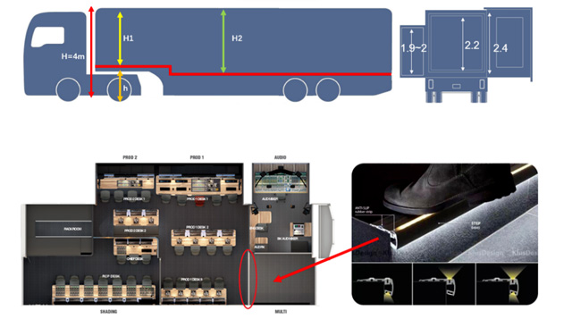 由于國家限定了轉播車在行駛中的尺寸,尤其是高度和寬度,無論選用什么車型,寬度都限定在2.55米以內,因此只有通過增加拉箱來擴展使用空間。